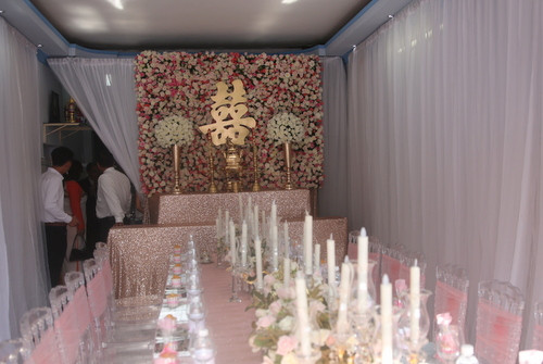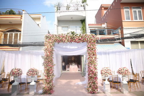 Nhà cô dâu được trang trí sang trọng, nhẹ nhàng với những tấm màn trắng, cổng hoa hồng.