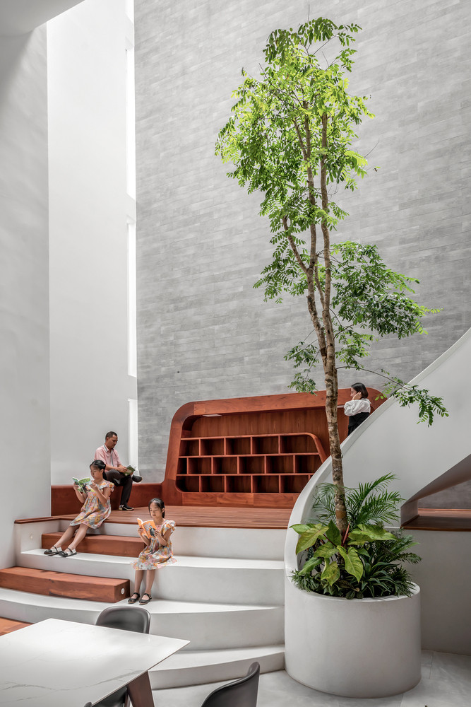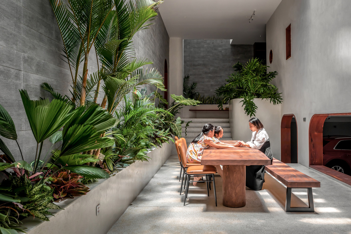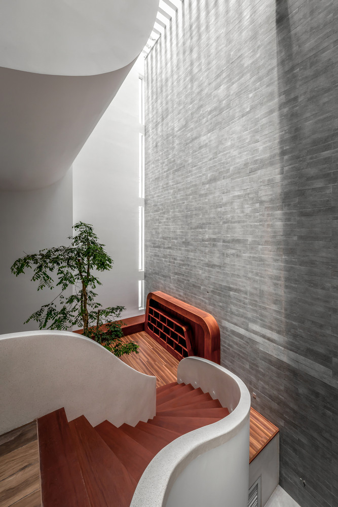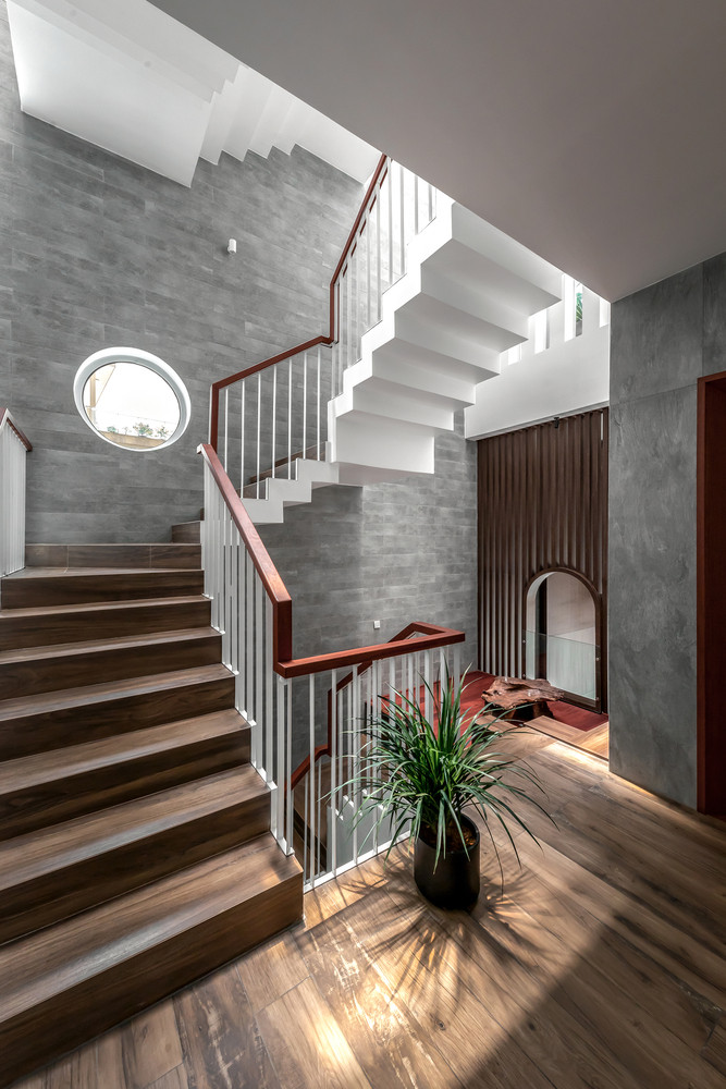 Để xóa bỏ cảm giác xa cách giữa các tầng, giữa các khu vực chung tầng, đội ngũ thiết kế đã biến chiếu nghỉ cầu thang thành các khu vui chơi giải trí có ánh sáng và cây xanh, tạo ra sự vui vẻ, hứng thú khi di chuyển lên cầu thang. Qua đó, các thành viên trong gia đình sẽ có dịp tương tác thường xuyên hơn.