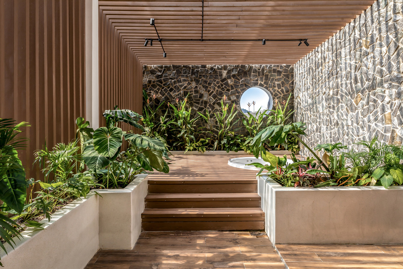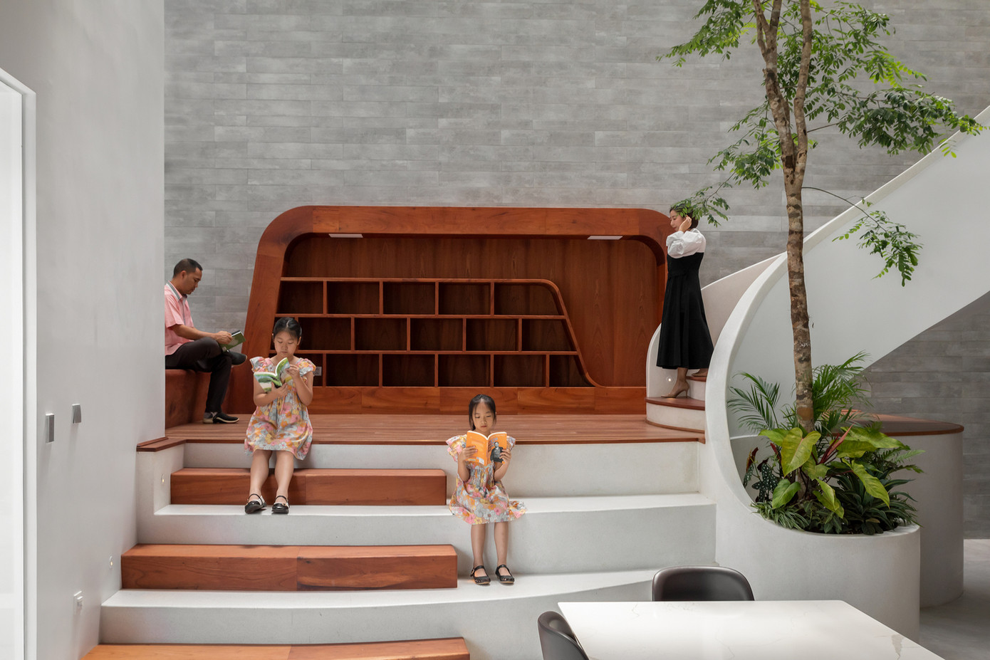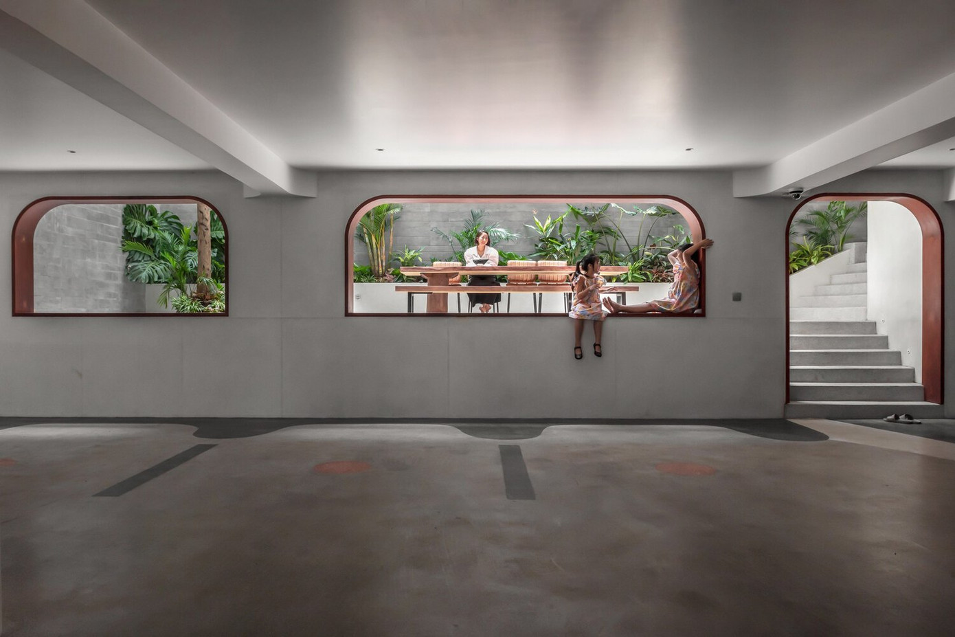 Để xóa bỏ cảm giác xa cách giữa các tầng, giữa các khu vực chung tầng, đội ngũ thiết kế đã biến chiếu nghỉ cầu thang thành các khu vui chơi giải trí có ánh sáng và cây xanh, tạo ra sự vui vẻ, hứng thú khi di chuyển lên cầu thang. Qua đó, các thành viên trong gia đình sẽ có dịp tương tác thường xuyên hơn.