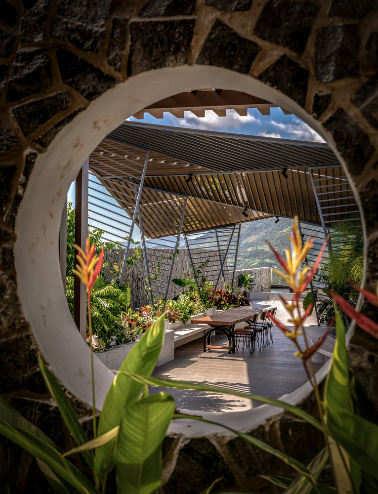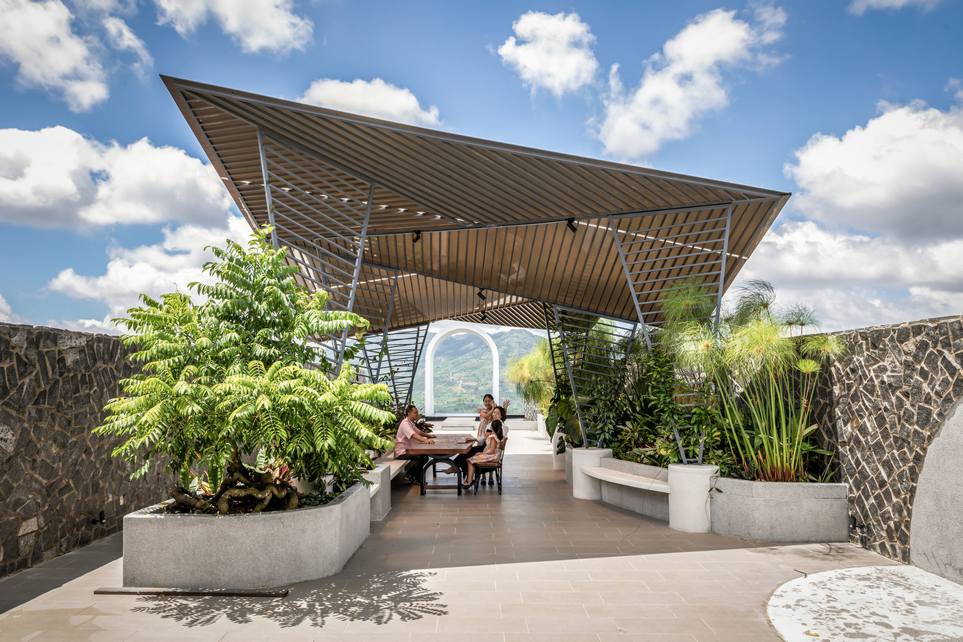 Tận dụng sân thượng, một khu vườn với mái che trở thành nơi tụ tập của gia đình để tận hưởng tầm nhìn đẹp ra thung lũng.