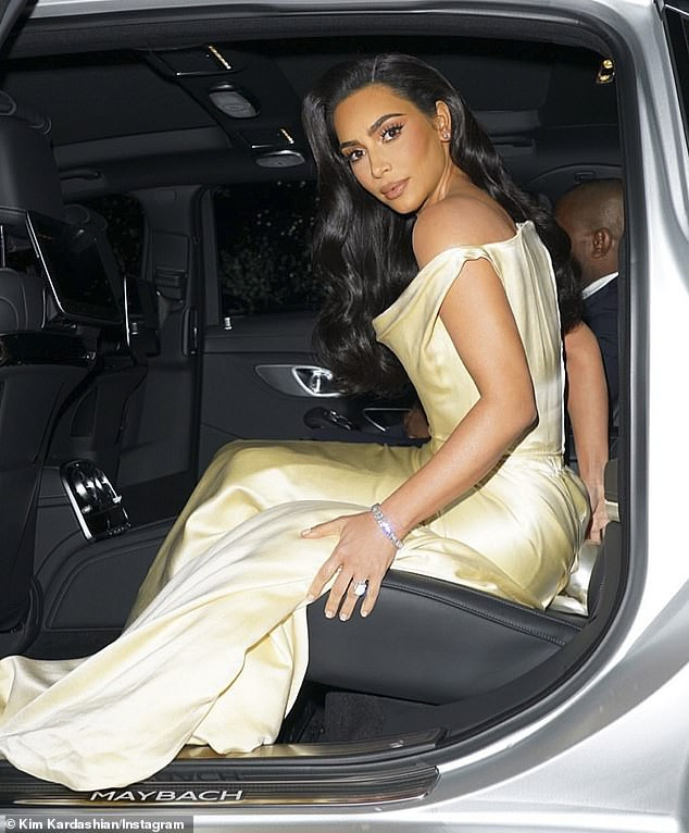Kim diện váy đuôi cá trễ vai màu sâm banh tôn vóc dáng "đồng hồ cát" trứ danh, mái tóc uốn lọn vén một bên đằm thắm, gợi cảm. Trong khi chồng cô diện vest đen lịch lãm.