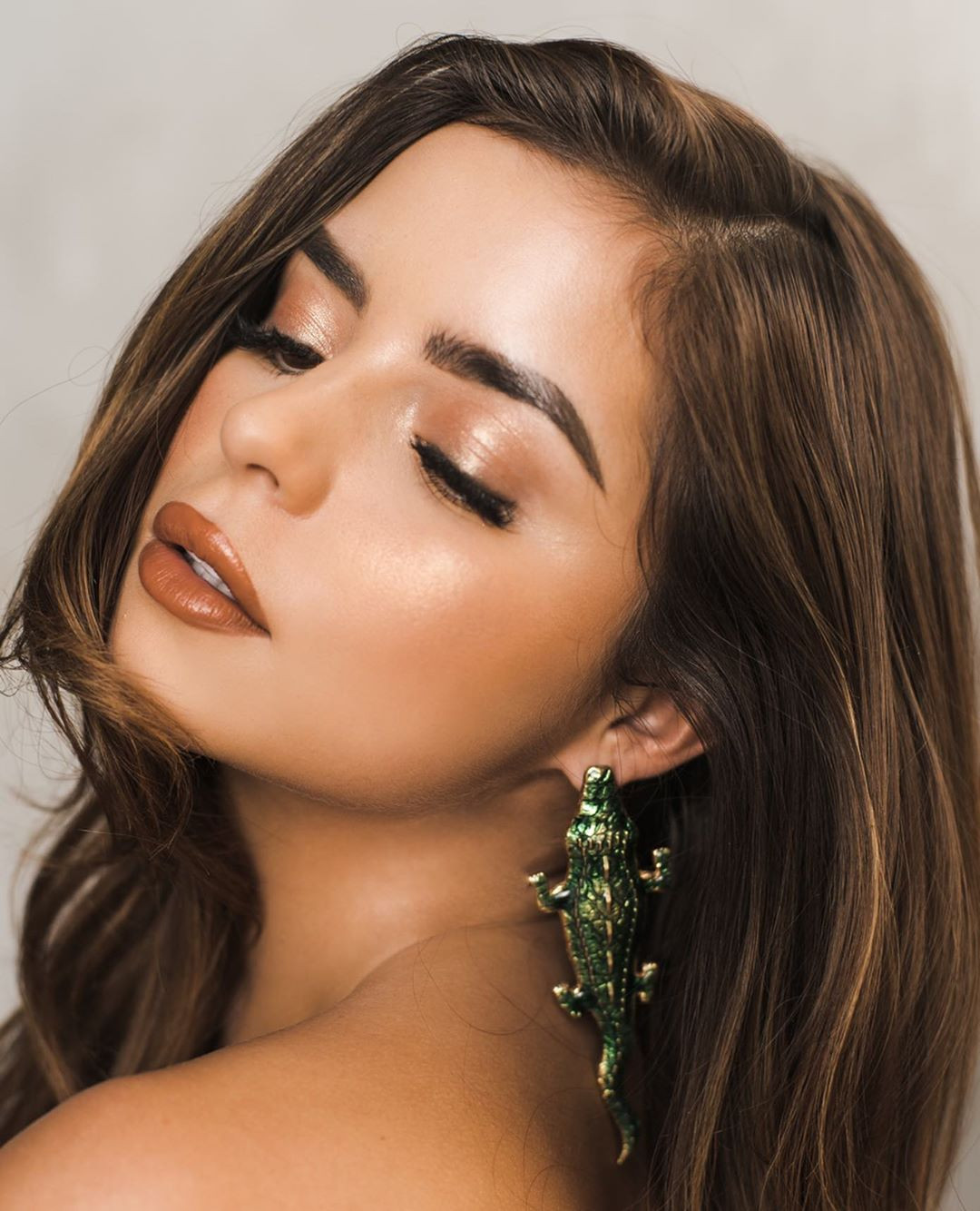 Người mẫu 24 tuổi đẹp "nín thở" với làn da bóng loáng không tì vết, kiểu trang điểm lấy tone nâu trùng với màu da làm chủ đạo. Mái tóc nâu buông xõa tự nhiên càng làm bật lên nét quyến rũ đầy bản năng, gợi tình.