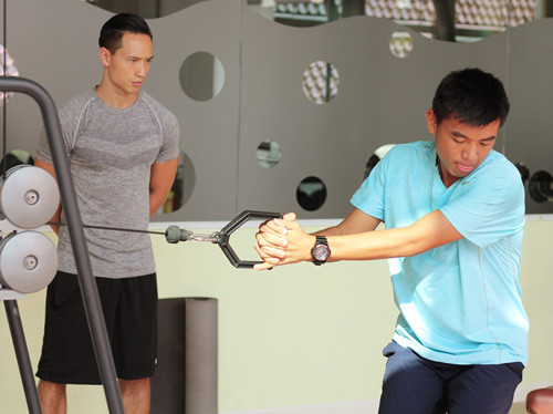 Trong buổi gặp gỡ đầu tiên, Kim Lý chia sẻ kinh nghiệm luyện tập thể hình cho tài năng số một quần vợt Việt Nam. Anh phân tích cặn kẽ cách hít thở, tăng cường hiệu quả các búi cơ vai, hông, bụng - những nhóm cơ quan trọng trong môn quần vợt.