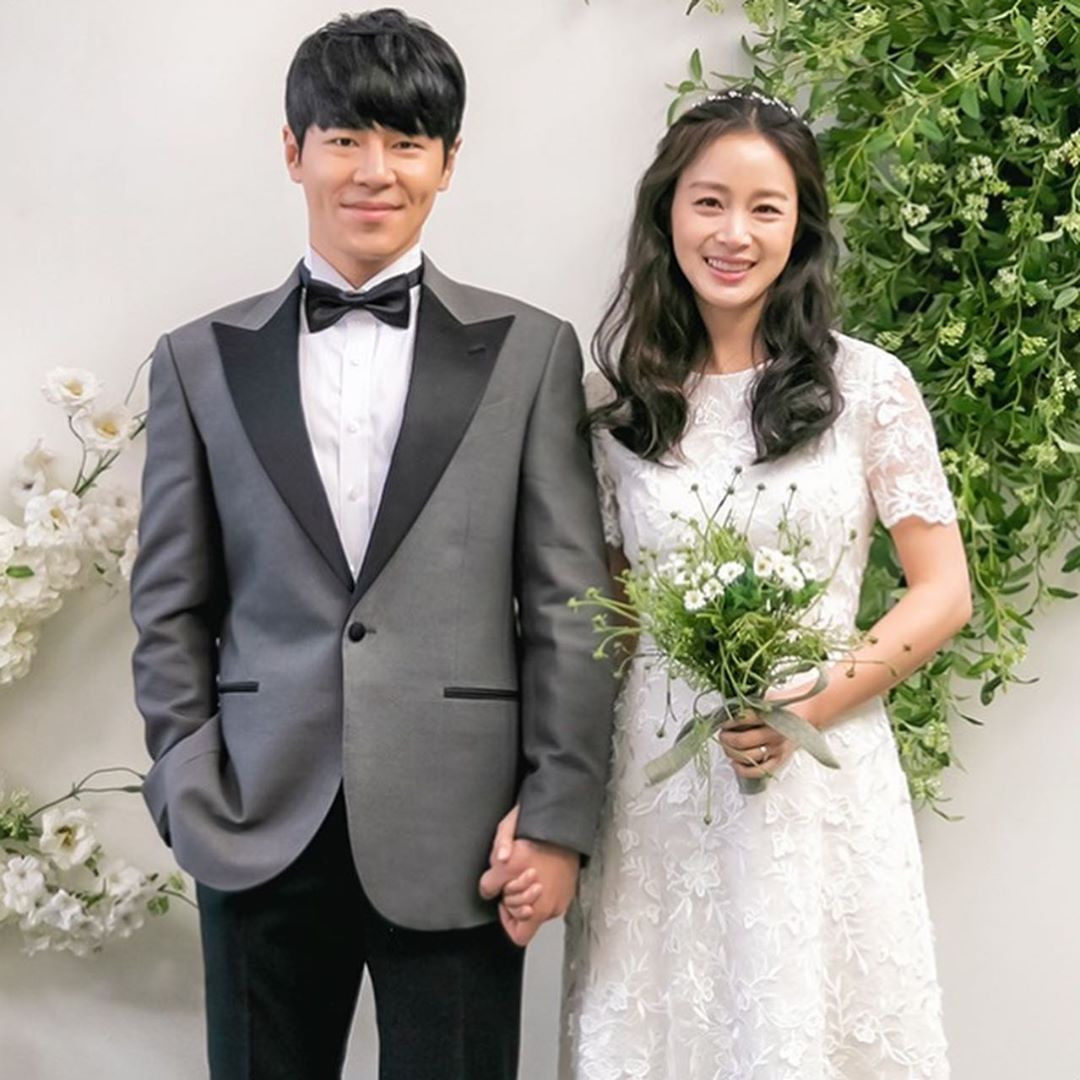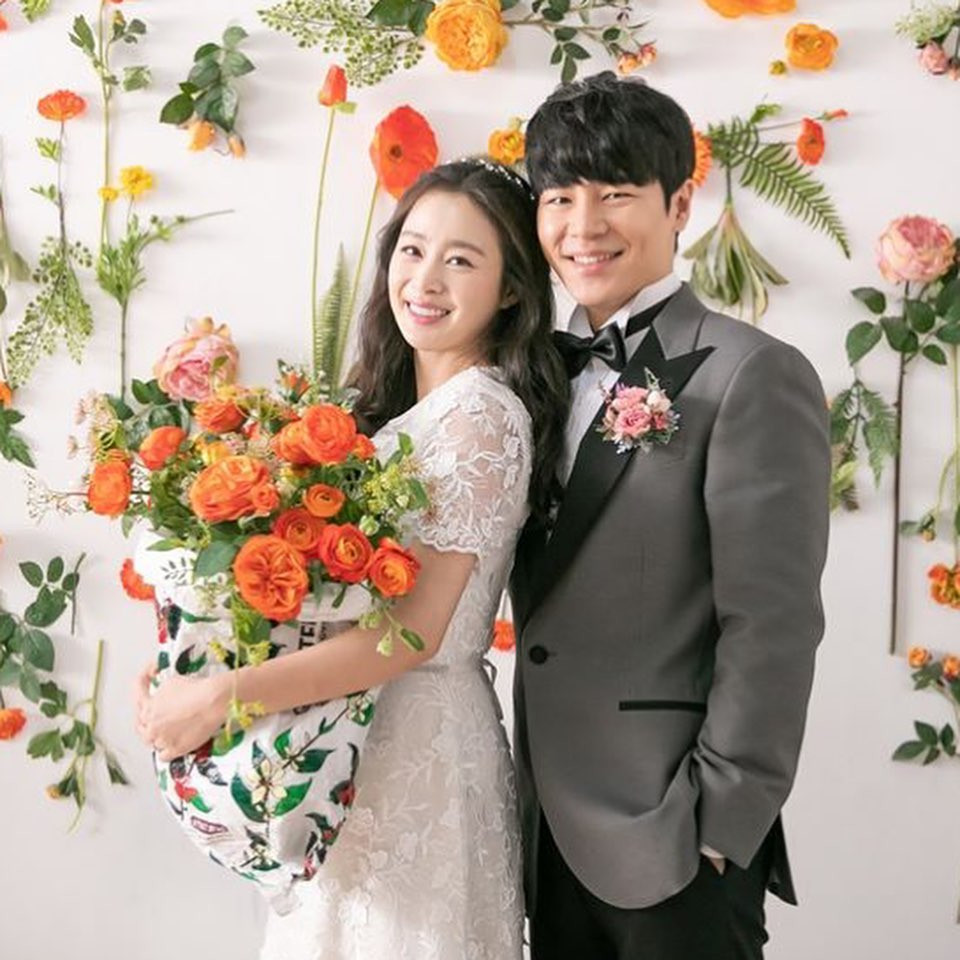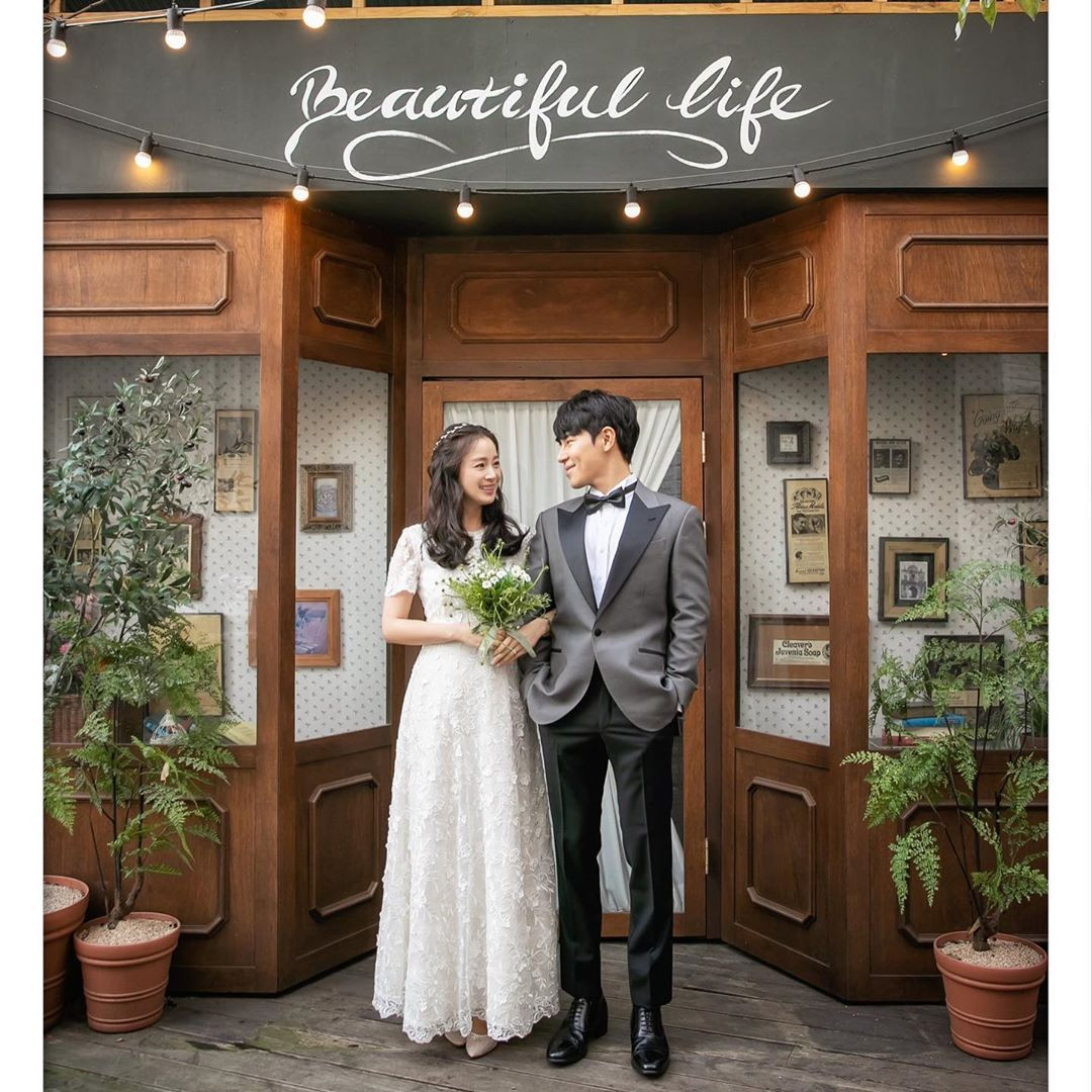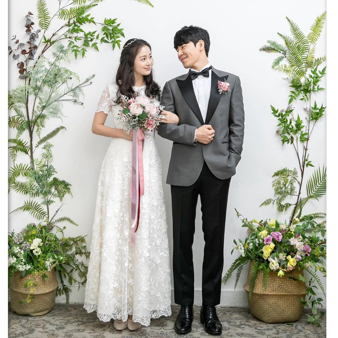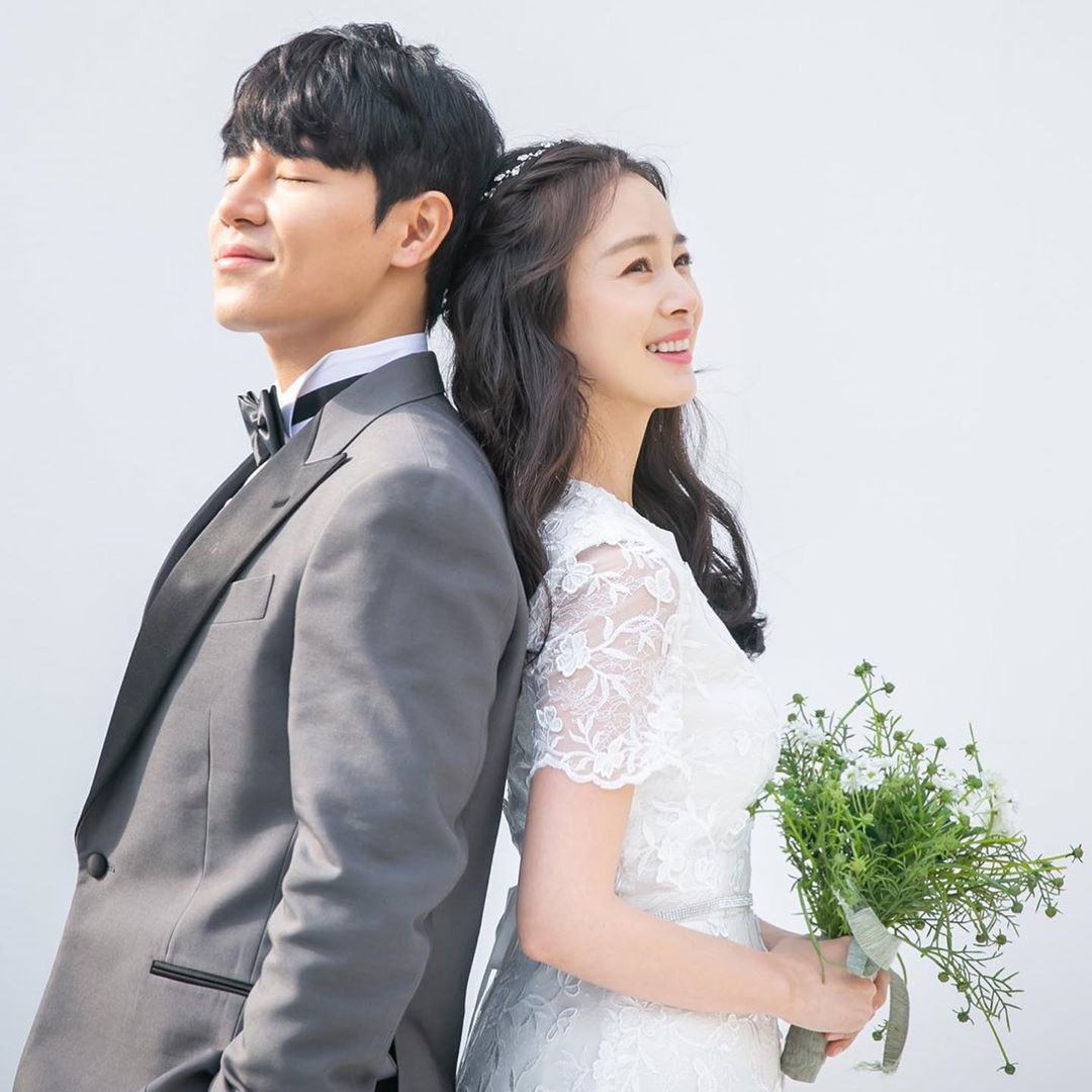 Trong loạt ảnh, Kim Tae Hee mặc váy cưới dài thướt tha màu trắng, sánh đôi bên "chồng trên phim" Lee Kyu Hyung.