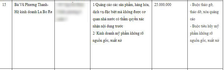 Trong mục xử phạt có ghi rõ, thương hiệu Dược - Mỹ phẩm của tác giả Gào vi phạm quảng cáo các sản phẩm, hàng hóa, dịch vụ đặc biệt mà không được cơ quan nhà nước có thẩm quyền xác nhận nội dung trước và kinh doanh mỹ phẩm không rõ nguồn gốc xuất xứ. Do đó, thương hiệu này sẽ bị xử phạt 25 triệu đồng, buộc phải tiêu hủy tất cả các sản phẩm không rõ nguồn gốc, xuất xứ, đồng thời phải tháo gỡ các quảng cáo có liên quan.