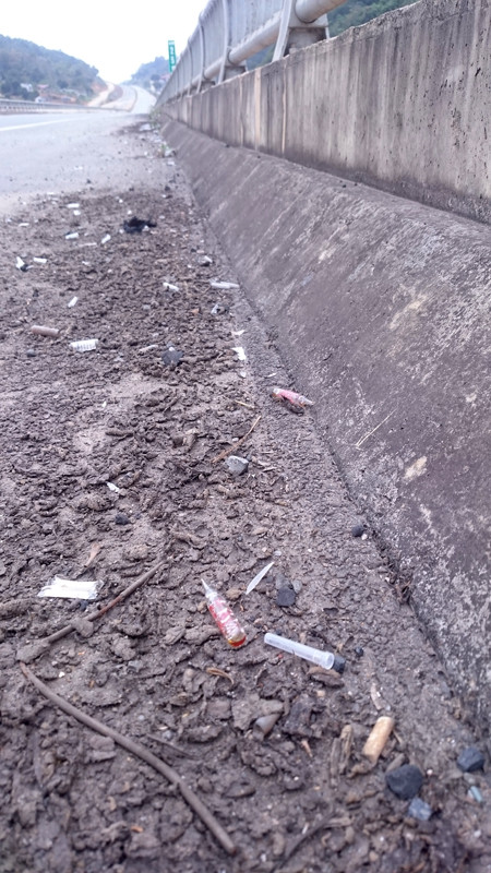 Theo ghi nhận của phóng viên Tiền Phong, tại khu vực cầu vượt giao cắt giữa cao tốc Nội Bài - Lào Cai với quốc lộ 4D, giáp ranh giữa phường Kim Tân và xã Đồng Tuyển (thành phố Lào Cai, tỉnh Lào Cai), rất nhiều bơm kim tiêm của các đối tượng nghiện hút vứt lại.