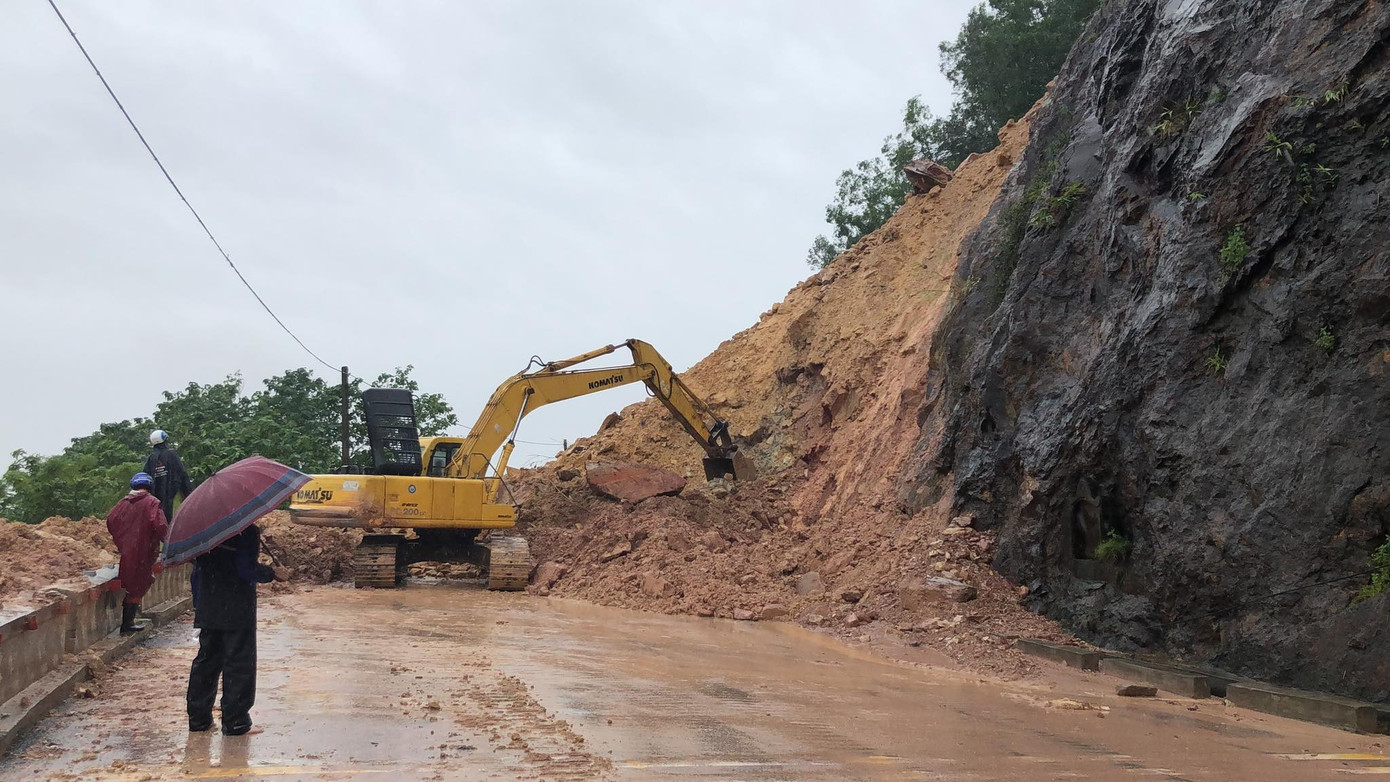 Hàng nghìn khối đất đá tràn xuống đường gây ách tắc. Đơn vị quản lý đường huy động 3 máy đào cùng 2 máy xúc thông đường.