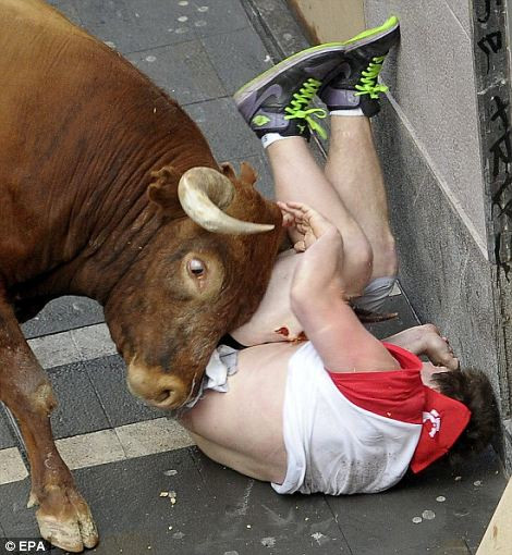 Một người đàn ông bị con bò tót quật ngã. Trước hôm diễn ra lễ hội đua bò, những người tham gia sẽ múa hát, uống rượu đến 6h sáng hôm bắt đầu lễ hội.