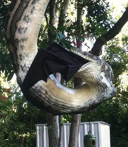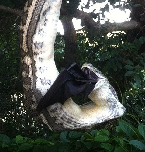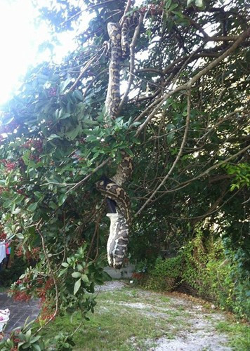 Tại Queensland, Australia, trong sân sau của một ngôi nhà, người dân cũng đã khiếp sợ khi bắt gặp cảnh tượng trăn khổng lồ đang thoải mái ăn thịt con cáo bay đen trên cây.