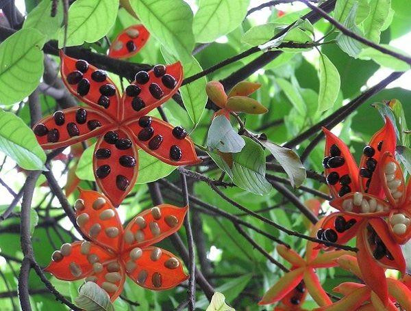 Khi quả chín, quả tách ra để lộ chuỗi hạt màu đen tuyền nhìn rất lạ mắt.