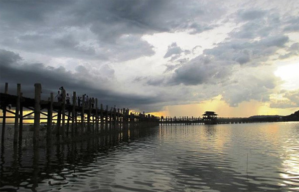 Cây cầu U Bein in trên dòng sông phẳng lặng buổi hoàng hôn.