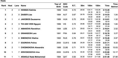 Nguyễn Thị Ánh Viên về đích thứ tư, sau 2 phút 15 giây 33. Kết quả này kém 1 giây 84 so với người có thành tích tốt nhất vòng loại là "Quý bà Thép" trên đường đua xanh Katinka Hozzsu.