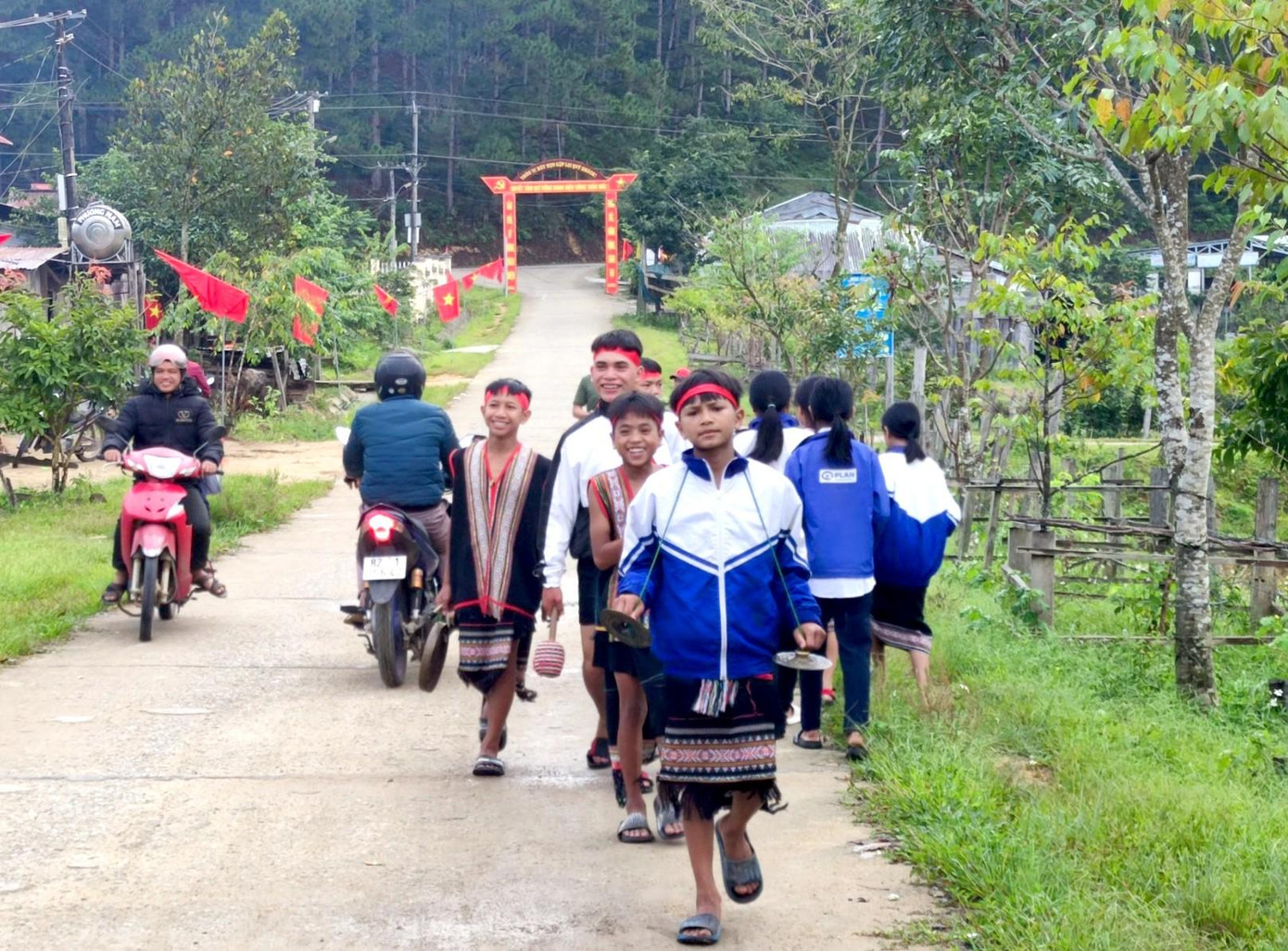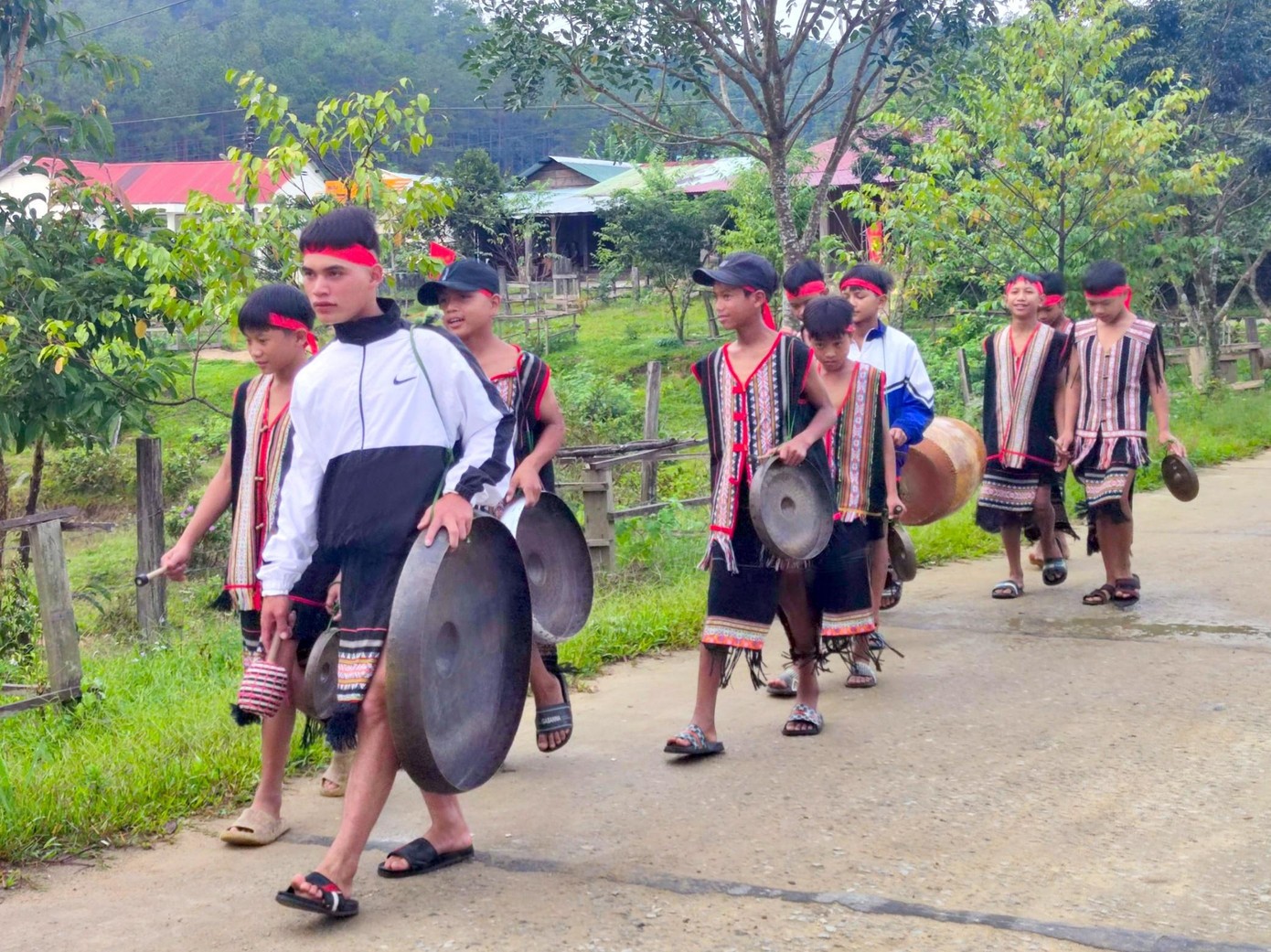 | Các em học sinh người Xơ Đăng mang cồng chiêng thể hiện tiết mục văn nghệ ngày tựu trường. |