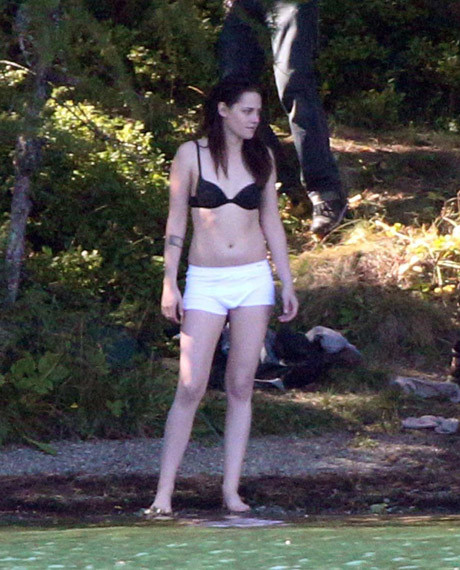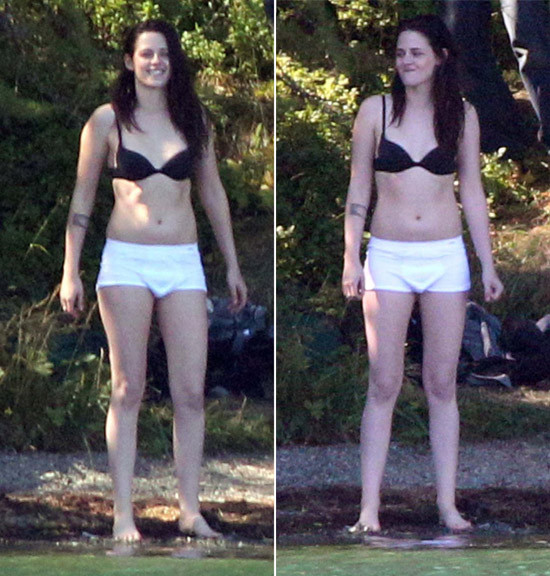 Nữ diễn viên trẻ diện nội y màu đen gợi cảm cùng chiếc soóc ngắn. Tuy nhiên, sự kết hợp này đã khiến Kristen bị lộ vòng hai ngấn mỡ không mấy thon thả, thậm chí ‘vùng kín’ của cô còn bị cộm lên trông rất phản cảm.