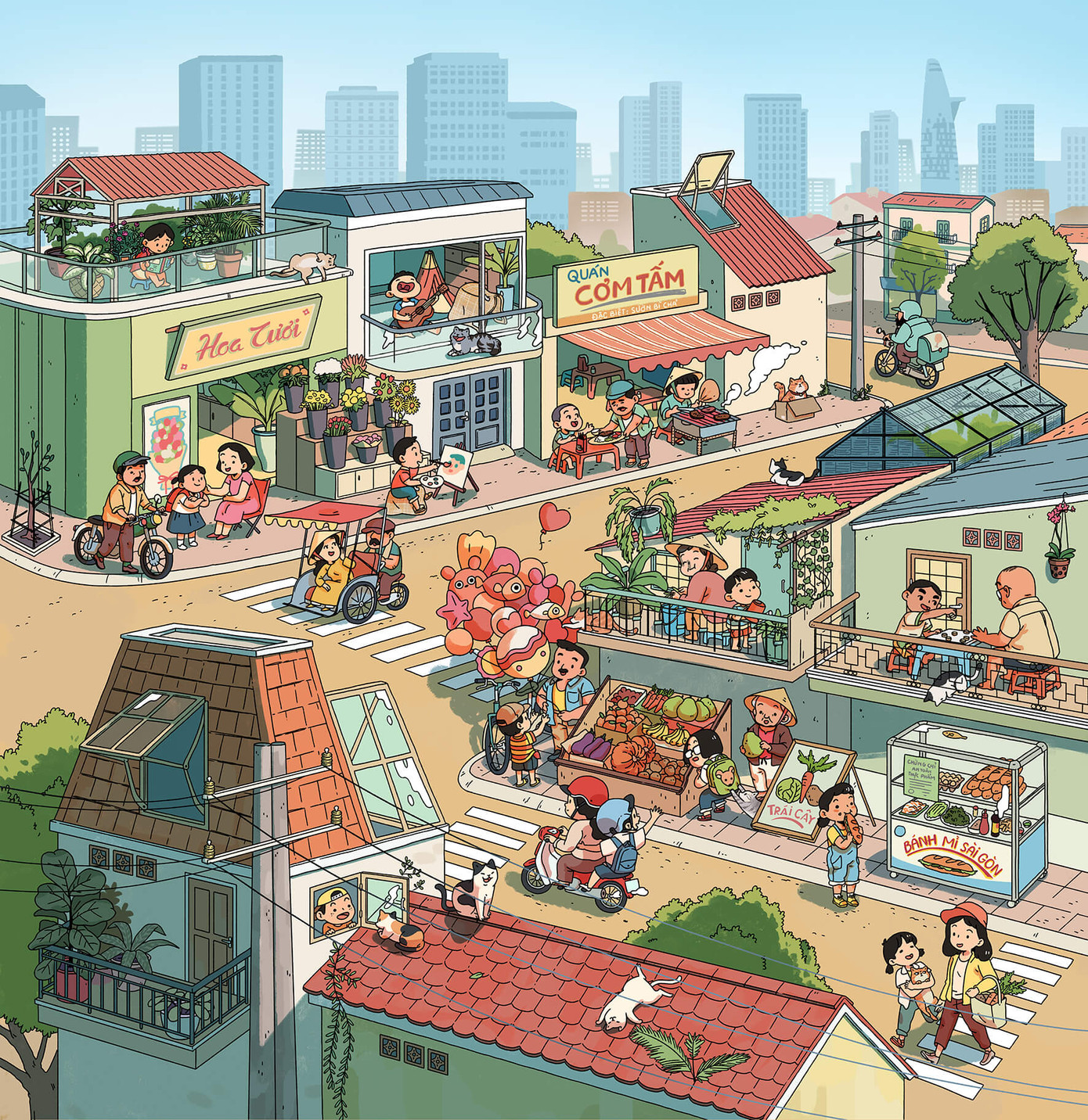 Vườn Illustration là một nhóm các họa sĩ minh họa Việt mang đến các tác phẩm với nguồn cảm hứng bất tận từ văn hóa và cuộc sống hàng ngày của Việt Nam. UNIQLO và Vườn Illustration đã hợp tác để mang đến một bức tranh tường cỡ lớn trong khu vực trưng bày này, nhằm phải ánh muôn vàn những lát cắt trong cuộc sống tại TP.HCM.