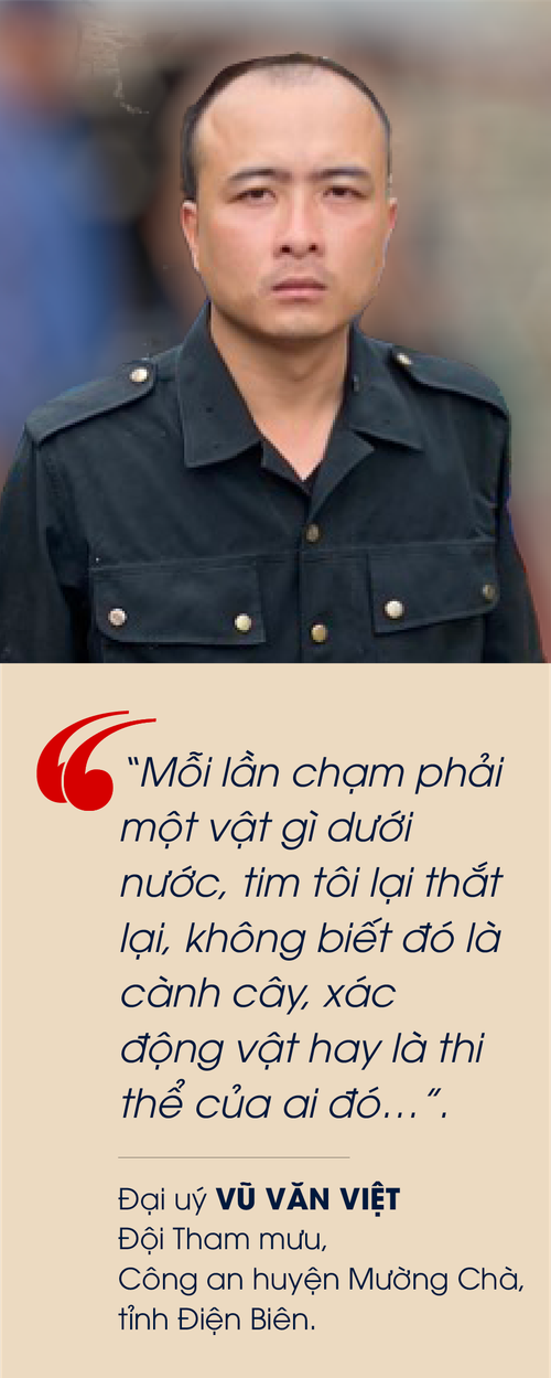 “Hai ngày đầu, chúng tôi còn có thể xuồng để tìm kiếm thi thể mất tích, cũng như hy vọng cứu được con lợn, con gà cho bà con. Nhưng từ ngày thứ 3 sau lũ, xuồng không thể hoạt động, tôi phải mặc áo phao, trực tiếp dầm mình trong dòng nước lũ để tìm kiếm thi thể. Xuống nước bơi bình thường đã mệt, bơi trong dòng nước ken đặc bởi rác, gỗ, cây, xác lợn chết, cá chết, gà chết… nổi lên lại càng khó. Mỗi lần chạm phải một vật gì dưới nước, tim tôi lại thắt lại, không biết đó là cành cây, xác động vật hay là thi thể của ai đó…” - Đại uý Việt ngược dòng ký ức.