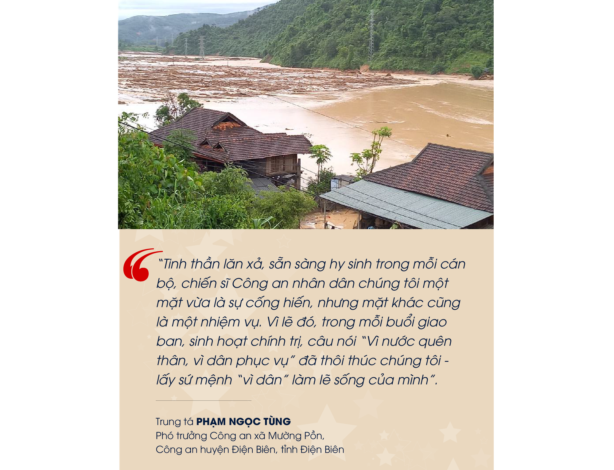 Hơn 3 tháng trôi qua, những hình ảnh tang thương của trận lũ vẫn còn đó. “Tinh thần lăn xả, sẵn sàng hy sinh trong mỗi cán bộ, chiến sĩ Công an nhân dân chúng tôi một mặt vừa là sự cống hiến, nhưng mặt khác cũng là một nhiệm vụ. Vì lẽ đó, trong mỗi buổi giao ban, sinh hoạt chính trị, câu nói “Vì nước quên thân, vì dân phục vụ” đã thôi thúc chúng tôi - lấy sứ mệnh “vì dân” làm lẽ sống của mình”, Trung tá Tùng chia sẻ.
