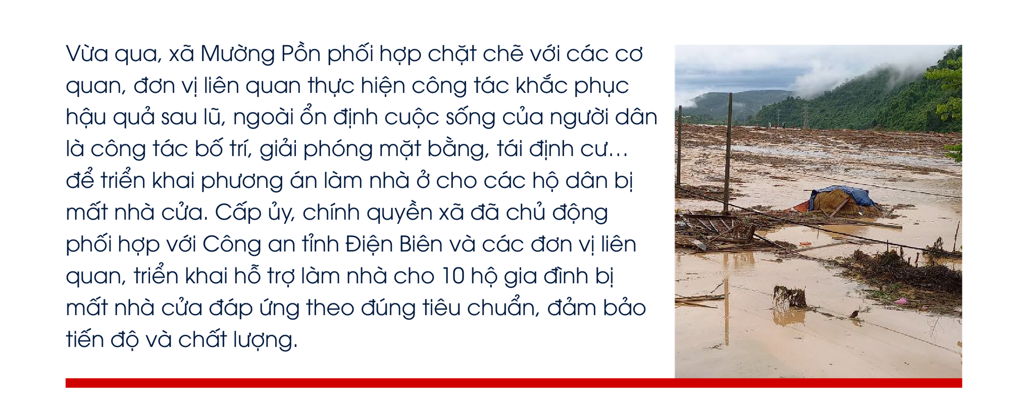 Hôm ấy, sau khi nhận tin báo xảy ra lũ quét ở Mường Pồn, Thượng tá Hoàng Ngọc Sơn - Phó Trưởng Công an huyện Mường Chà, tỉnh Điện Biên đã huy động lực lượng ứng trực 100% có mặt tại hiện trường trong những giờ đầu tiên sau khi lũ quét qua 3 bản Mường Pồn 1, Lĩnh và Tin Tốc. Ngay trong đêm, mỗi cán bộ, chiến sĩ đi gõ cửa từng hộ dân, gõ kẻng thông báo sơ tán.