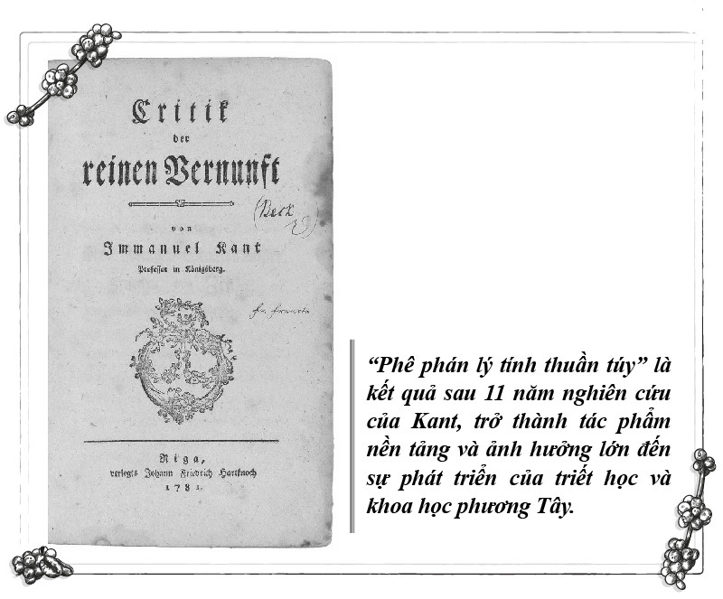 Đặc biệt, kể từ năm 1770, Immanuel Kant dành toàn bộ thời gian và công sức vào nghiên cứu. Thành quả sau 11 năm là một loạt các tác phẩm vĩ đại ra đời: Phê phán lý tính thuần túy (1781); Phê phán lý tính thực tiễn (1788), Phê phán phán đoán (1790)… Tất cả thể hiện quan điểm triết học của Kant trên ba khía cạnh cơ bản của con người: Con người trong mối quan hệ với tự nhiên; con người trong mối quan hệ với con người, xã hội; con người trong mối quan hệ với chính mình.
