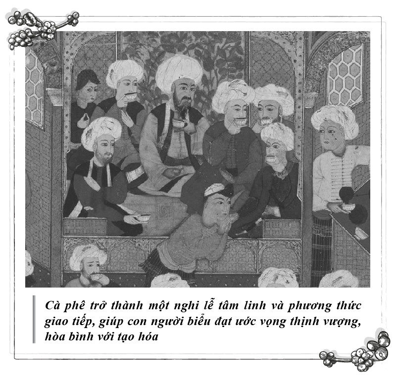 Khởi sinh từ vùng đất Ethiopia vào thế kỷ thứ 9, đến thế kỷ 15, cà phê đã phổ biến rộng khắp thế giới Hồi giáo. Giai đoạn đầu của lịch sử cà phê, loại thức uống mang lại sự tỉnh táo, kích thích sáng tạo được xem là một thức uống thần thánh. Cà phê, nghi lễ cà phê, bã cà phê cùng với thi ca, lời cầu nguyện… trở thành một hệ thống giao tiếp, kết nối giữa cộng đồng giáo dân với thần linh. Trong các buổi thực hành tôn giáo, cà phê giúp tăng kết nối về mặt tinh thần, biểu đạt sự thành kính, cũng như mong muốn được che chở và ban phước lành của giáo dân.