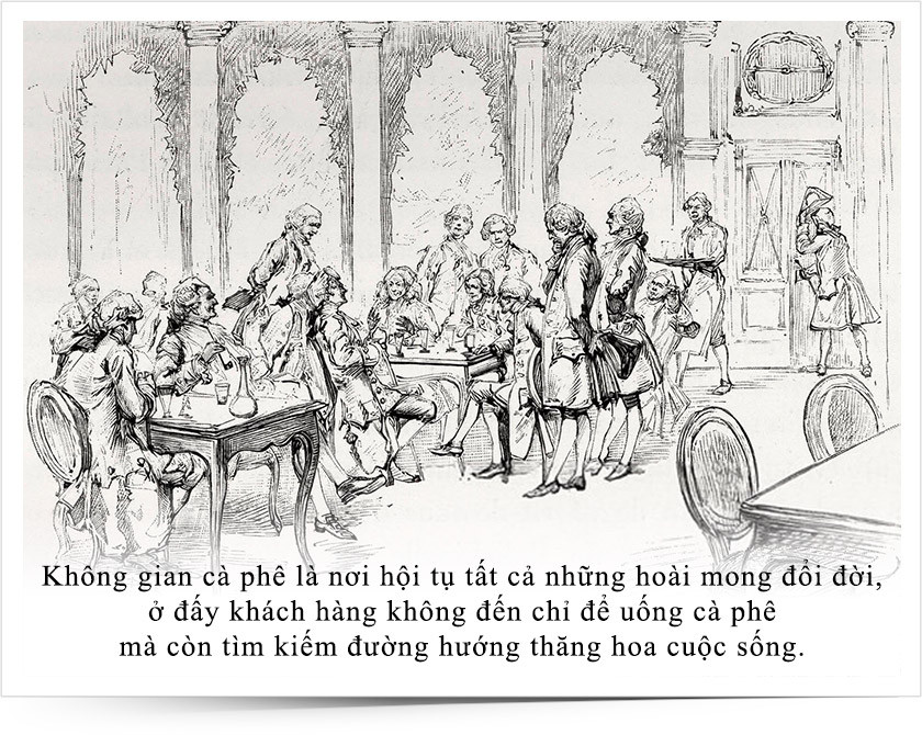 Quán cà phê là không gian độc đáo, tại đó mọi người, không phân biệt tầng lớp đều có thể gặp gỡ chia sẻ quan điểm cá nhân, thảo luận những sáng tạo mới, đáp ứng nhu cầu lĩnh hội và quảng bá tri thức. Vì thế, hàng quán cà phê trở thành trung tâm khởi xuất ý tưởng, chuyển hóa tư duy trong thời kỳ khai sáng.