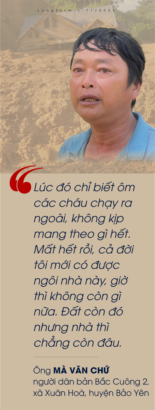 Chia sẻ với phóng viên Tiền Phong, ông Mà Văn Chứ, người dân bản Bắc Cuông 2, xã Xuân Hoà, huyện Bảo Yên, không khỏi bùi ngùi khi kể lại khoảnh khắc kinh hoàng trong đêm 8/9. Vào khoảng 10 giờ tối hôm đó, khi cả bản đang dần chìm vào giấc ngủ, một tiếng nổ lớn bất ngờ vang lên, tiếp theo là đất đá ồ ạt tràn xuống từ trên núi. Ông Chứ lúc đó đang ở nhà cùng ba đứa cháu mồ côi. “Lúc đó tôi chỉ biết ôm các cháu chạy ra ngoài, không kịp mang theo gì hết. Mất hết rồi, cả đời tôi mới có được ngôi nhà này, giờ thì không còn gì nữa. Đất còn đó nhưng nhà thì chẳng còn đâu”- nói đến đây, giọng ông nghẹn lại, đôi mắt ông đỏ hoe.