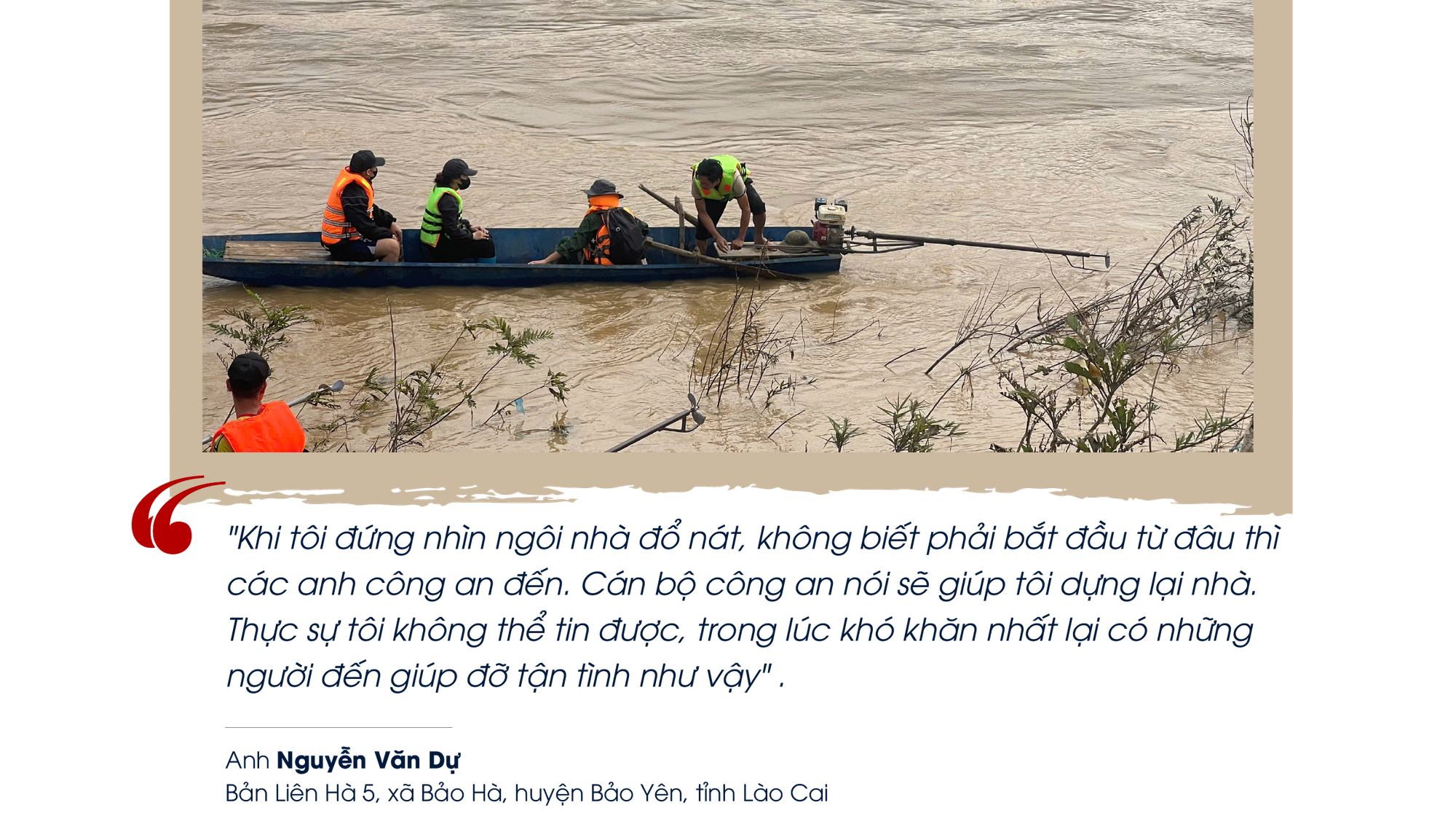 Anh Nguyễn Văn Dự (ở bản Liên Hà 5, xã Bảo Hà, huyện Bảo Yên, tỉnh Lào Cai) là một trong những trường hợp không còn nơi nào để nương náu sau cơn lũ chia sẻ: "Khi tôi đứng nhìn ngôi nhà đổ nát, không biết phải bắt đầu từ đâu thì các anh công an đến. Cán bộ công an nói sẽ giúp tôi dựng lại nhà. Thực sự tôi không thể tin được, trong lúc khó khăn nhất lại có những người đến giúp đỡ tận tình như vậy".