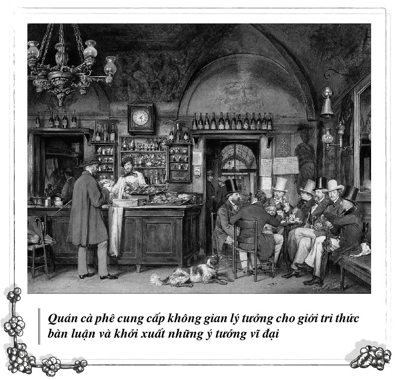 Tại Pháp, không gian Café Procope huyền thoại là nơi hội tụ của giới tri thức tinh hoa như Diderot, Rousseau, Voltaire… Quán De la Régence lại là chốn tranh luận yêu thích của những nhà khai sáng Robespierre (một trong những nhà lãnh đạo Cách mạng Pháp 1789), Napoléon Bonaparte (Hoàng đế Pháp), Benjamin Franklin (người sáng lập nước Mỹ), Karl Marx (người sáng lập Chủ nghĩa Xã hội khoa học)… Trong khi đó, không gian Gran Caffè Gambrinus nổi tiếng của Ý là nơi chứng kiến tất cả các trí thức, chính trị gia và nghệ sĩ bao gồm Salvatore Di Giacomo, Libero Bovio, Benedetto Croce, Eduardo De Filippo và Enrico De Nicola… đến bàn luận về những cuộc chuyển đổi văn hóa, giương cao khát vọng hợp nhất dân tộc.