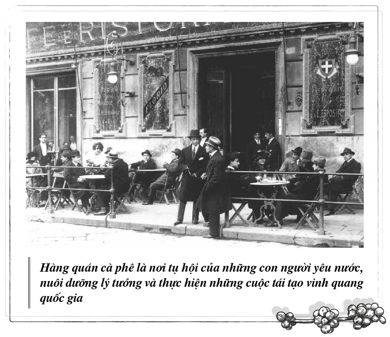 Riêng với Ý, hàng quán cà phê đóng vai trò rất quan trọng trong quá trình đổi mới tư tưởng chính trị và thống nhất đất nước. Tại quán Gran Caffè Renzelli, Domenico Frugiuele cùng Gianfelice Petrassi đã thúc đẩy cuộc nổi dậy chống lại Vương quốc Bourbons vào năm 1844 và quyết định tuyên bố chính phủ lập hiến. Quán Caffè Pedrocchi lại là nơi gặp gỡ quan trọng đối với những người yêu nước trong cuộc nổi dậy Thống nhất Ý. Ngày này, ở bất kỳ thành bang nào của Ý cũng có quán cà phê chứng tích lịch sử. Tại Milan, quán cà phê Caffè della Peppina, Caffè-Pasticceria Cova là nơi hoạt động của Hội Thanh niên Italia. Tại Naples, quán cà phê Gran Caffè Gambrinus là điểm gặp gỡ nổi tiếng nhất của giới trí thức theo chủ nghĩa Neapolitan. Hay Caffè dell’Infrascata là nơi những thanh niên yêu nước đã hô vang khẩu hiệu “Nước Ý tự do và trường tồn” trước khi bị đàn áp vào năm 1801.