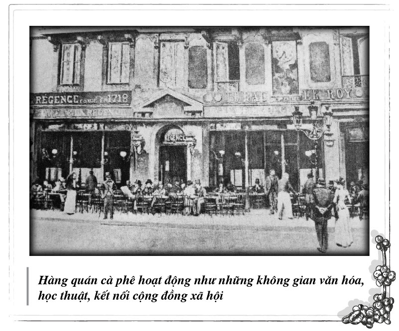 Từ phương Đông du nhập vào châu Âu và lan tỏa khắp thế giới, cà phê cùng hàng quán cà phê đóng vai trò là nguồn năng lượng xúc tác cho những ý tưởng mới, là không gian kết nối xã hội, thúc đẩy các cuộc thảo luận, nghiên cứu về các vấn đề thời cuộc, đáp ứng nhu cầu lĩnh hội và quảng bá tri thức nhằm hướng đến một xã hội tốt đẹp hơn. Được xem là một phần không gian văn hóa đô thị trong lịch sử phát triển của nhiều quốc gia, hàng quán cà phê đã đảm nhận cùng lúc nhiều vai trò: trường học, thư viện, trung tâm phát hành báo chí, nhà hát, trụ sở chính trị, câu lạc bộ văn học – nghệ thuật, kinh doanh… góp phần hình thành nên những thiết chế giáo dục, văn hóa, chính trị, kinh tế quan trọng.