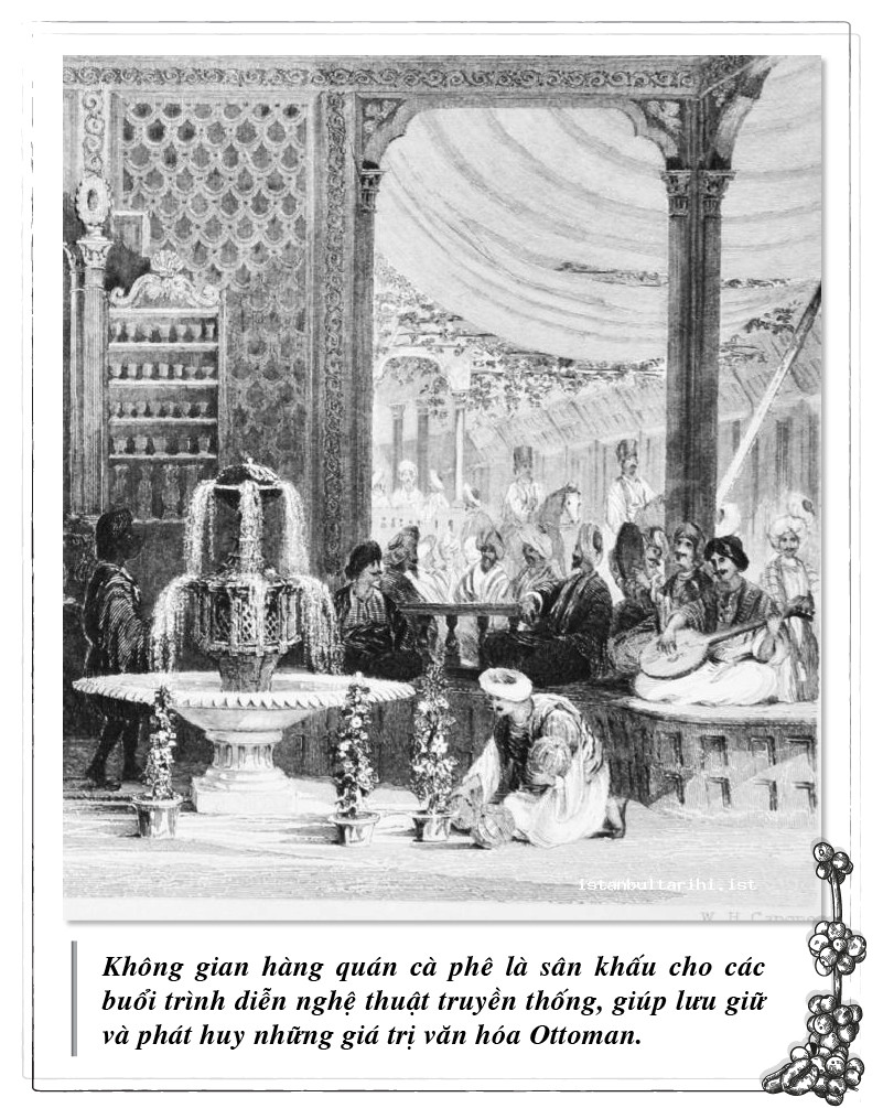 Được ví như những nhà hát kịch giúp lưu truyền và phát huy những giá trị văn hóa truyền thống của người Ottoman, các hình thức nghệ thuật sân khấu truyền thống như: Karagöz (kịch rối bóng), Meddah (kể chuyện và bắt chước), kịch truyền thống Orta, âm nhạc dân gian Âşıklık… đều được tổ chức trong quán cà phê. Người nghệ sĩ trình diễn, người dân sẽ tụ tập xem trong khi uống cà phê. Các tiết mục thường được lấy cảm hứng từ thơ ca, câu đối, truyện dân gian, chủ đề cuộc sống hoặc ngẫu hứng sáng tạo và đấu khẩu trực tiếp giữa các nghệ sĩ khác.