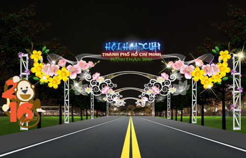 Cổng chính Hội hoa xuân Tao Đàn ở đường Trương Định được trang trí hình đóa hoa sen từ cánh đồng tượng trưng cho đất nước đang vươn lên. Song song là hình ảnh gia đình nhà khỉ sum vầy - linh vật của xuân Bính Thân.