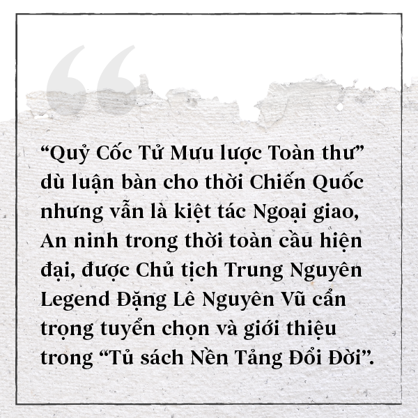 “Quỷ Cốc Tử mưu lược toàn thư” là một trong những đầu sách quý thuộc Tủ sách Nền Tảng Đổi Đời được Nhà sáng lập - Chủ Tịch Tập đoàn Trung Nguyên Legend Đặng Lê Nguyên Vũ cẩn trọng, tuyển chọn thuộc lĩnh vực Chính trị – Ngoại giao – Quân sự trong "Tủ sách Nền Tảng Đổi Đời".