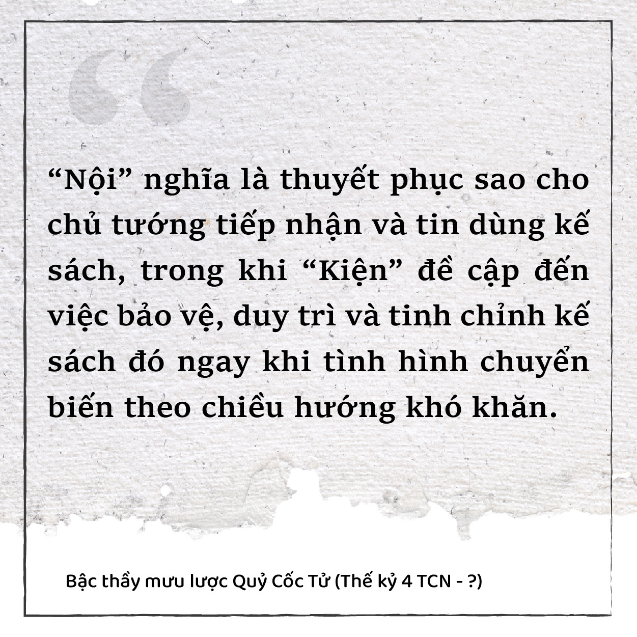 Trong tác phẩm “Qủy Cốc Tử mưu lược toàn thư”, Nội kiện là một trong những thuật giao tiếp chiến lược sâu sắc. Nếu xét về mối quan hệ giữa chủ tướng (người nghe) và thuộc cấp (người nói, thường là nhà du thuyết hoặc quân sư), việc trình bày luận điểm và duy trì kế sách đã được vạch ra là yếu tố then chốt quyết định sự gắn bó bền vững giữa hai bên. “Nội” nghĩa là thuyết phục sao cho chủ tướng tiếp nhận và tin dùng kế sách, trong khi “Kiện” đề cập đến việc bảo vệ, duy trì và tinh chỉnh kế sách đó ngay khi tình hình chuyển biến theo chiều hướng khó khăn.