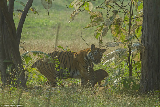 Tuy nhiên nhiếp ảnh gia Souvik Kundu đã cho người xem thấy một cái kết có hậu với nai con trong một loạt những hình ảnh hiếm thấy mà anh ghi lại được. Đó là cảnh hổ cái vờn bắt, chơi đùa với nai con như con đẻ của mình thay vì ngấu nghiến con nai bé bỏng.