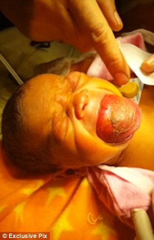 Theo các bác sỹ, cậu bị mắc một chứng bệnh hiếm gặp mang tên Macroglossia, nôm na là lưỡi to bất thường. Chiếc lưỡi này to tới mức cậu bé sẽ chết ngạt nếu không được phẫu thuật ngay. Rất may, các bác sỹ đã phẫu thuật thành công khối u trong lưỡi cậu bé sau khi cậu chào đời 4 ngày.