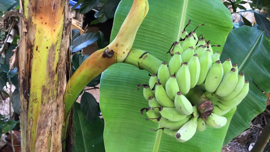 Theo quan sát, buồng chuối trổ từ giữa thân có 5 nải, mỗi nải có khoảng chục trái đang phát triển rất tốt