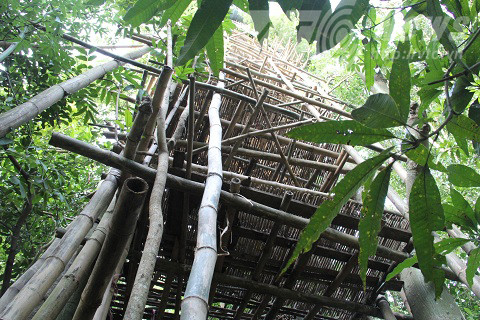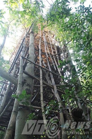 Điều đặc biệt là nó không hề có cầu thang hay dây chằng gì cả. Ai muốn lên được tầng cao nhất thì chỉ còn cách bám theo những thanh tre nứa và len lỏi dần lên phía trên.
