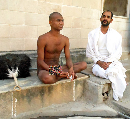 Các thầy tu Digambara tuyệt nhiên không mặc bất cứ một loại quần áo nào, họ chỉ mang theo bên mình một chiếc chổi được bện từ lông công để xua đuổi nhẹ nhàng những con côn trùng và một quả bầu khô đựng nước để rửa tay chân, tuyệt nhiên không được tắm.