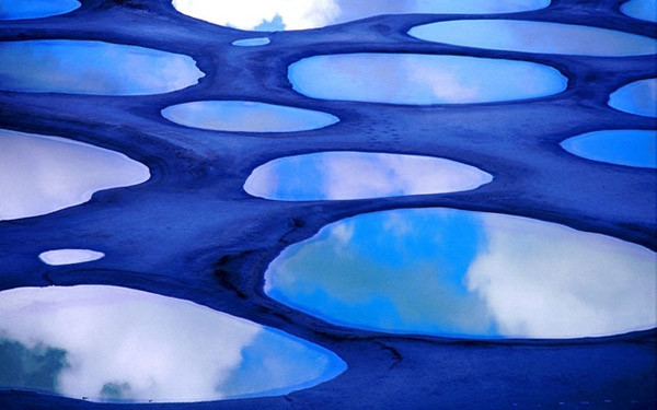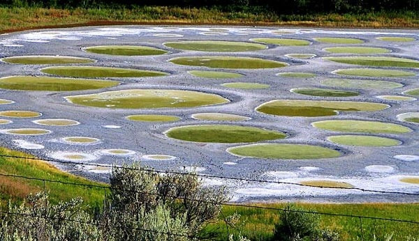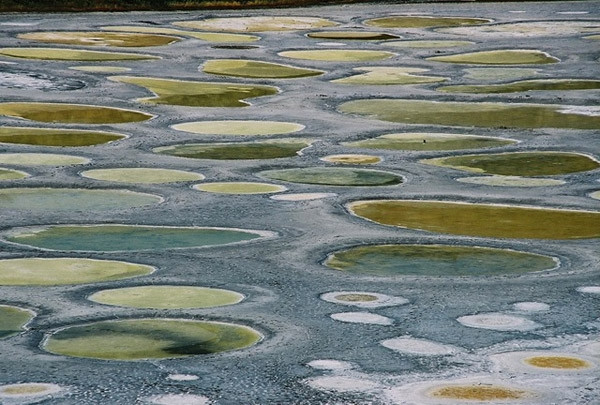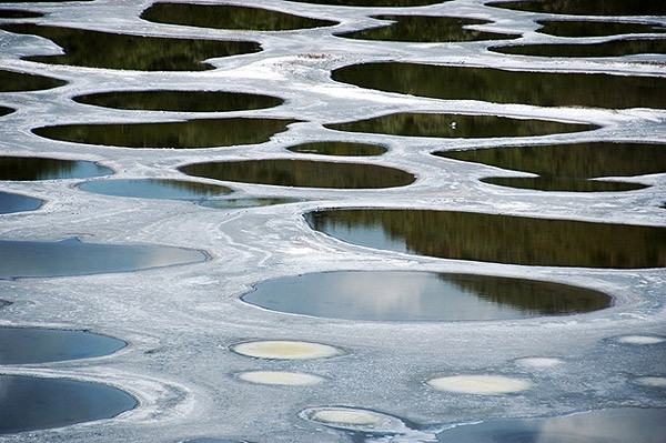 Vào mùa hè, hầu hết nước trong hồ bốc hơi hết, để lại trên bề mặt các loại khoáng chất. Những khoáng chất này tạo thành những chấm bi lớn. Tùy theo lượng khoáng chất và sự kết hợp của các chất hóa học với nhau, các chấm bi này sẽ đổi màu. Các chất có sulfate lưu lại, đông cứng, tạo thành những “đường đi” giữa các chấm bi này.