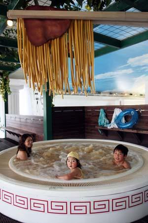 Dịch vụ ngâm mình trong nước trà xanh được đổ trực tiếp ra từ một ấm trà khổng lồ cũng rất thu hút khách hàng