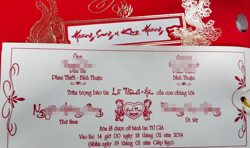Trên tấm thiệp mời đám cưới không thấy ghi đầy đủ tên cha mẹ thân sinh hai bên gia đình.