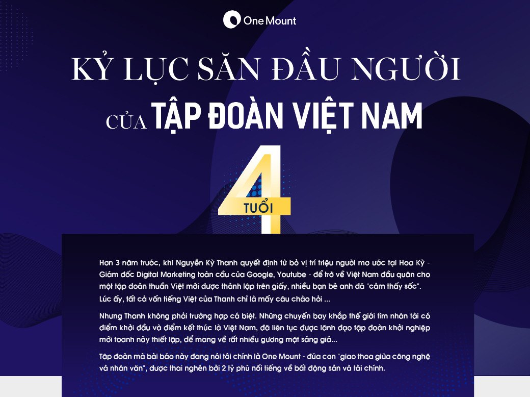 Vào một ngày của mấy năm trước, Trần Hoài Việt Anh, 30 tuổi, đang làm Giám đốc một quỹ đầu tư lớn quy mô hàng trăm tỷ đô tại Hoa Kỳ, góp mặt trong hội thảo tìm kiếm nhân tài tại New York. Khán phòng hội thảo hôm đó có một nhân vật bay sang từ Việt Nam. Chị vừa là lãnh đạo vừa là chuyên gia "săn đầu người" của One Mount. Lập tức, chàng trai Việt đang làm việc ở Mỹ được "thợ săn" này quan tâm đặc biệt với những điểm tốc ký... trong đầu. Thứ nhất, dù là người phụ trách quỹ đầu tư rất lớn, nhưng Việt Anh luôn thể hiện thái độ khiêm tốn. Thứ hai, trụ lại được ở vị trí giám đốc quỹ đầu tư vài trăm tỷ đô, ngoài giỏi thì tính cách chàng trai này phải cực kỳ cẩn thận, chắc chắn, chi tiết thì mới có thể "cân" được cả hội đồng quản trị quỹ.