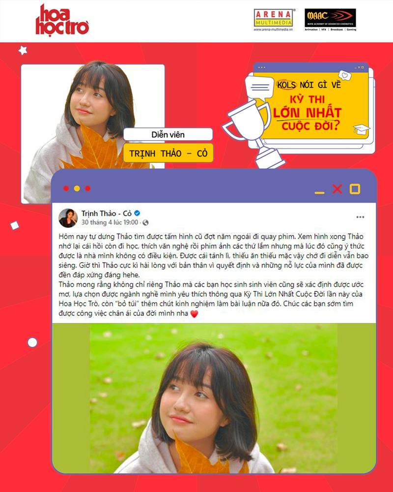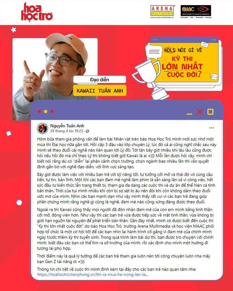 Cuộc thi Kỳ thi lớn nhất cuộc đời với tổng giá trị giải thưởng lên đến 400 triệu đồng do Hoa Học Trò phối hợp cùng Hệ thống Đào tạo Mỹ thuật Đa phương tiện Arena Multimedia và Học viện Kỹ xảo Điện ảnh & Hoạt hình MAAC tổ chức nhằm mục đích cổ vũ, khuyến khích các bạn trẻ Gen Z ở độ tuổi từ 15 đến 22 trên toàn quốc dũng cảm theo vượt qua rào cản định kiến để theo đuổi đam mê thực sự của bản thân.