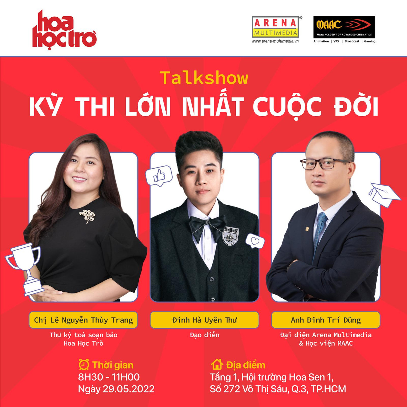 Tất cả mọi người đều có cơ hội tham dự Gala Trao giải để gặp gỡ, giao lưu cùng các thí sinh cũng như BGK “xịn xò”: Đạo diễn Đinh Hà Uyên Thư, Chị Lê Nguyễn Thùy Trang - Thư ký tòa soạn báo Hoa Học Trò, Anh Đinh Trí Dũng - Giám đốc Hệ thống Arena Multimedia và Học viện MAAC.