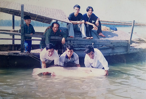 Cầm hai tấm hình chụp cảnh con trai đang đứng giữa sông, ôm một con cá rất lớn, màu vàng óng, ông Lới bảo đó là cá sủ vàng ông bắt được năm 1998, bán 170 triệu đồng.