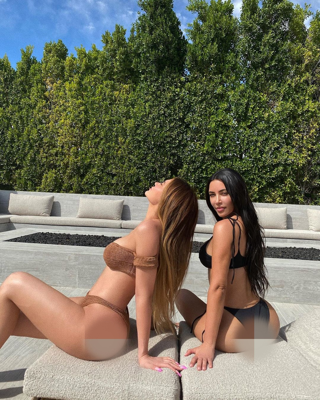 Cô út tỉ phú Kylie Jenner cùng chị gái Kim Kardashian diện bikini nhỏ xíu khoe thân hình đồng hồ cát với "vòng 3 ngoại cỡ" tắm nắng bên bể bơi ở Palm Springs.