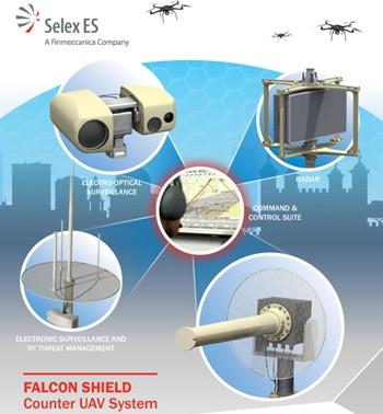 Tại Triển lãm Thiết bị An ninh và Quốc phòng Quốc tế (DSEI) ở London vừa qua, công ty quốc phòng Selex ES, Anh, giới thiệu một hệ thống điều khiển điện từ có khả năng phát hiện, khống chế máy bay không người lái (UAV) cỡ nhỏ, giúp ngăn ngừa các vụ tấn công tiềm tàng. Tên đầy đủ của hệ thống này là Lá chắn Chim ưng (Falcon Shield) chống UAV, theo IBTimes.