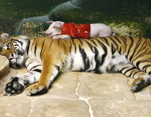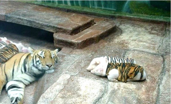 Sở dĩ có những hình ảnh này là do sự cố ý của nhân viên vườn thú nhằm lôi kéo du khách đến xem hiện tượng kỳ lạ mẹ hổ con lợn này.