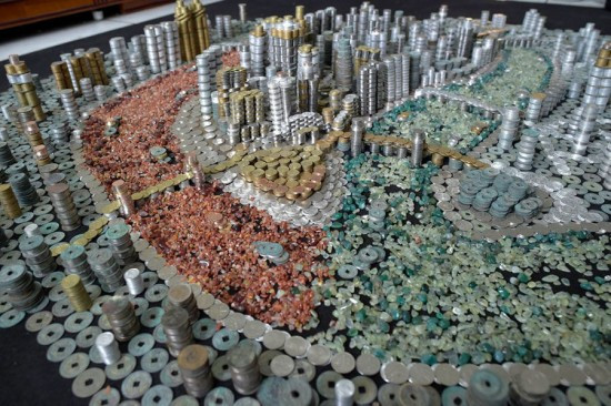 Sau một tháng cùng với hơn 50.000 đồng xu của 11 nước khác nhau, một mô hình thành phố thu nhỏ với các tòa cao ốc, đường phố và nơi giao nhau của sông Gia Lăng và Dương Tử đã hiện ra rõ ràng mà không hề cần đến một giọt keo nào.